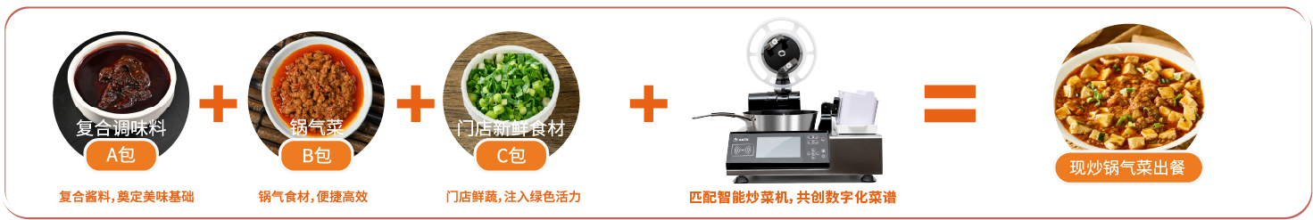 新雅軒針對炒菜機器人特性定制研發「標準化專用醬料」,整體顆粒均勻、高溫耐受、風味穩定,解決「普通醬料」結塊或粘稠導致投料系統堵塞、高溫導致焦糊或風味揮發等難題,標準化工藝打造,無需復雜調味,搭配新雅軒“A+B+C”標準化出餐模式,一醬即成菜,保障菜品風味精準復刻,千店如一!